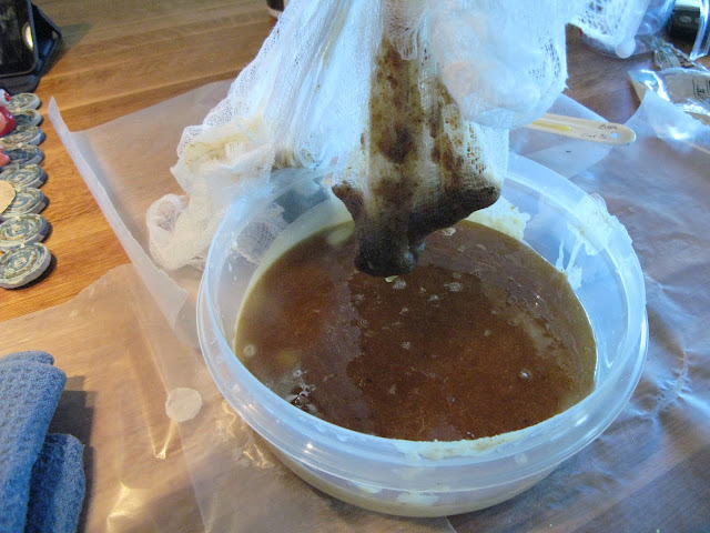 If you need to filter your beeswax (AKA: Strain all the broken souls of bees out of it, also their legs and bodies), melt the wax in your double boiler and pour it through the cheesecloth into a bowl you never want to use for food again.